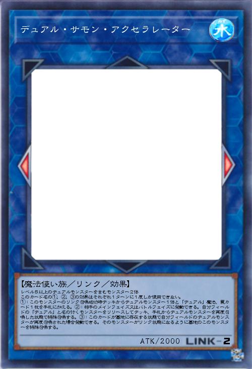 | レベル5以上のデュアルモンスターを含むモンスター2体 このカード名の①、②、③の効果はそれぞれ1ターンに1度しか使用できない。 ①:このモンスターのリンク召喚成功時デッキからデュアルモンスター1体と「デュアル」魔法、罠カード1枚を手札に加える。②:相手のメインフェイズ又はバトルフェイズに発動できる。自分フィールドの「デュアル」と名の付くモンスターをリリースしてデッキ、手札からデュアルモンスターを再度召喚した状態で特殊召喚する。③:このカードが墓地に存在する状態で自分フィールドのデュアルモンスターが再度召喚された場合発動できる。そのモンスターがリンク状態になるように墓地のこのモンスターを特殊召喚する。 | |||