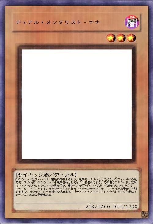 | ①このカードはフィールド・墓地に存在する限り、通常モンスターとして扱う。②フィールドの通常モンスター扱いのこのカードを通常召喚としてもう1度召喚できる。その場合このカードは効果モンスター扱いとなり以下の効果を得る。●ライフを800ポイント支払い発動する。デッキからカードを1枚ドローする。それがサイキック族モンスターかデュアルモンスターだった場合、公開する事で、そのモンスターを特殊召喚出来る。「デュアル・メンタリスト‐ナナ」のこの効果は1ターンに1度だけ発動出来る。 | |||