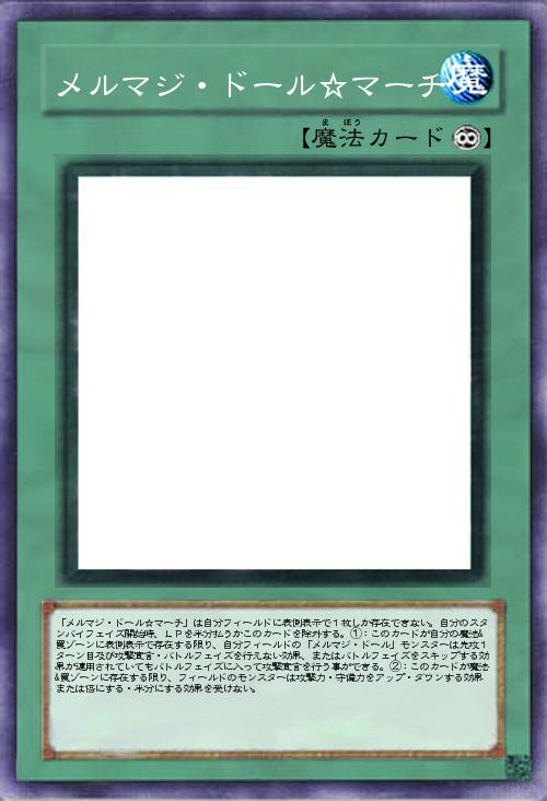 | 「メルマジ・ドール☆マーチ」は自分フィールドに表側表示で1枚しか存在できない。自分のスタンバイフェイズ開始時、LPを半分払うかこのカードを除外する。①:このカードが自分の魔法&罠ゾーンに表側表示で存在する限り、自分フィールドの「メルマジ・ドール」モンスターは先攻1ターン目及び攻撃宣言・バトルフェイズを行えない効果、またはバトルフェイズをスキップする効果が適用されていてもバトルフェイズに入って攻撃宣言を行う事ができる。②:このカードが魔法&罠ゾーンに存在する限り、フィールドのモンスターは攻撃力・守備力をアップ・ダウンする効果または倍にする・半分にする効果を受けない。 | |||
