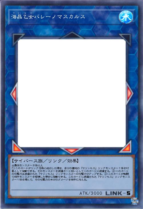 「リンク5のマリンセスを作りました。名前の由来はシロナガスクジラの英名から名付けました。リンク召喚に成功するとマリンセスリンクモンスターを自身に装備、装備されたマリンセスリンクモンスターの攻撃力分の自己強化、相手モンスターを戦闘破壊した場合に装備されたマリンセスリンクモンスターの攻撃力の半分のダメージを与えられます。海晶乙女の闘海で墓地のマリンセスリンクモンスターを装備すればその分攻撃力も上がりますが、このカード自身には耐性が全くないので除去には弱いです。」(2019-09-04 11:12)