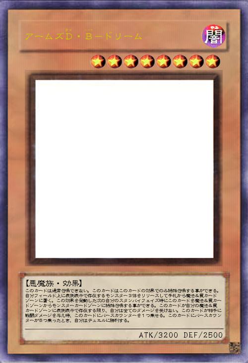 「アームズDの元ネタのラスボスで、効果はヴェノミナーガを参考にしました。アームズDデッキの特徴は、どんな高レベルモンスターが来ても、事故にならない事ですね。タイムラグはあるものの、強力なモンスターをノーコストで出せます。」(2012-04-14 22:18)