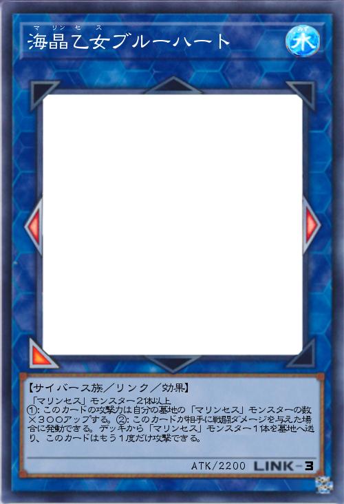 「アニメVRAINSでマリンセスの使い手であるブルーメイデンにちなんでこの名前にしました。墓地のマリンセスの数に応じた自己強化と相手モンスターを戦闘破壊した際にデッキからマリンセスモンスターを墓地へ送って再攻撃する効果にしてあります。」(2019-09-04 22:22)