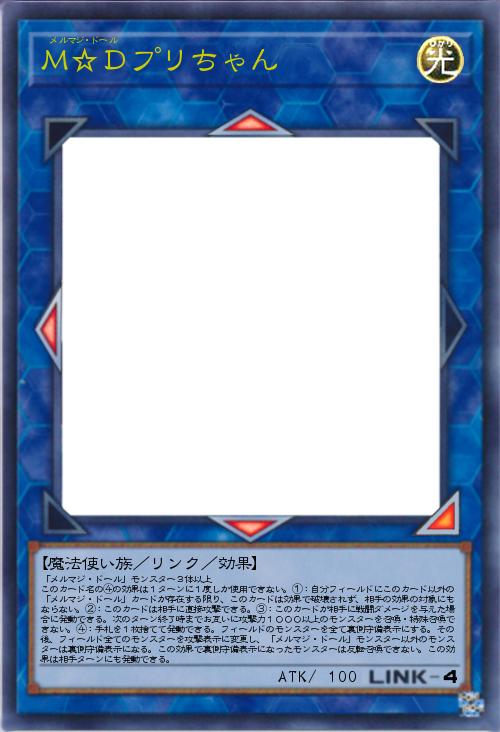 | 「メルマジ・ドール」モンスター3体以上 このカード名の④の効果は1ターンに1度しか使用できない。①:自分フィールドにこのカード以外の「メルマジ・ドール」カードが存在する限り、このカードは効果で破壊されず、相手の効果の対象にもならない。②:このカードは相手に直接攻撃できる。③:このカードが相手に戦闘ダメージを与えた場合に発動できる。次のターン終了時までお互いに攻撃力1000以上のモンスターを召喚・特殊召喚できない。④:手札を1枚捨てて発動できる。フィールドのモンスターを全て裏側守備表示にする。その後、フィールド全てのモンスターを攻撃表示に変更し、「メルマジ・ドール」モンスター以外のモンスターは裏側守備表示になる。この効果で裏側守備表示になったモンスターは反転召喚できない。この効果は相手ターンにも発動できる。 | |||