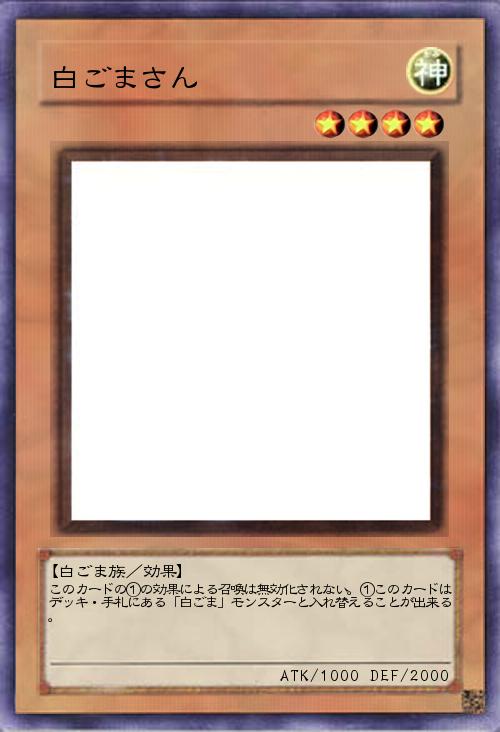 | このカードの①の効果による召喚は無効化されない。①このカードはデッキ・手札にある「白ごま」モンスターと入れ替えることが出来る。 | |||