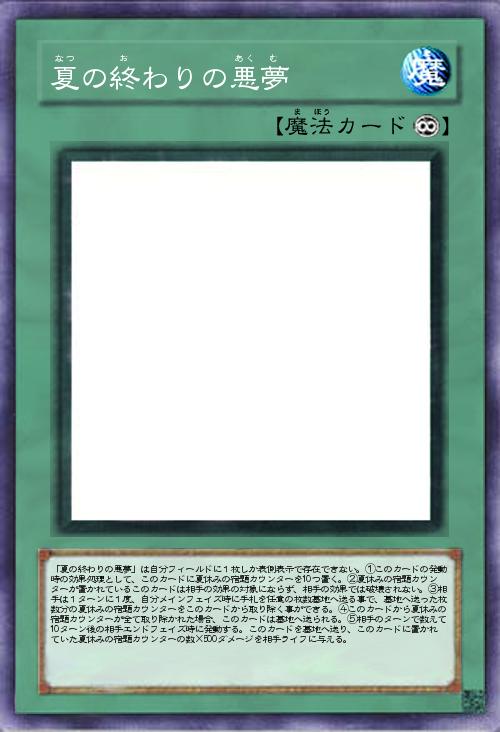 | 「夏の終わりの悪夢」は自分フィールドに1枚しか表側表示で存在できない。①このカードの発動時の効果処理として、このカードに夏休みの宿題カウンターを10つ置く。②夏休みの宿題カウンターが置かれているこのカードは相手の効果の対象にならず、相手の効果では破壊されない。③相手は1ターンに1度、自分メインフェイズ時に手札を任意の枚数墓地へ送る事で、墓地へ送った枚数分の夏休みの宿題カウンターをこのカードから取り除く事ができる。④このカードから夏休みの宿題カウンターが全て取り除かれた場合、このカードは墓地へ送られる。⑤相手のターンで数えて10ターン後の相手エンドフェイズ時に発動する。このカードを墓地へ送り、このカードに置かれていた夏休みの宿題カウンターの数×500ダメージを相手ライフに与える。 | |||