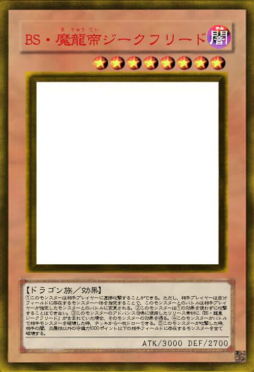 | ①このモンスターは相手プレイヤーに直接攻撃することができる。ただし、相手プレイヤーは自分フィールドに存在するモンスター一体を指定することで、このモンスターとのバトルは相手プレイヤーが指定したモンスターとのバトルに変更される。②このモンスターは①の効果を使わずに攻撃することはできない。③このモンスターのアドバンス召喚に使用したリリース素材に「BS・龍皇ジークフリード」が含まれていた場合、そのモンスターの効果を得る。④このモンスターがバトルで相手モンスターを破壊した時、デッキから一枚ドローできる。⑤このモンスターが攻撃した時、相手の闇、炎属性以外の守備力1000ポイント以下の相手フィールドに存在するモンスターを全て破壊する。 | |||