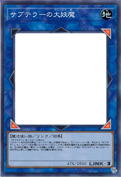 「サブテラーマリスには属さない方のサブテラーリンクモンスター。ターン1でサブテラーモンスターを手札から特殊召喚する効果とリンク先のサブテラーをバウンスして魔法・罠カードの発動を無効にする効果にしてあります。」(2019-09-12 23:05)