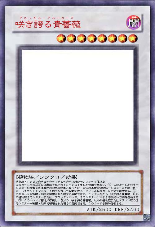 | 植物族・ドラゴン族チューナー+チューナー以外のモンスター1体以上 このカード名の②③の効果はそれぞれ1ターンに1度しか使用できない。①:このカードが相手モンスターの攻撃または相手の効果の対象となった時、自分の墓地の植物族モンスターまたは「ローズ・ドラゴン」モンスター1体を除外して発動できる。フィールドのカードを全て破壊する。②:このカードが戦闘・効果で破壊された場合に発動できる。EXデッキから「咲き誇る青薔薇」以外の植物族Sモンスターまたは「ブラック・ローズ」Sモンスター1体をS召喚扱いで特殊召喚する。③:このカードが墓地に存在し、自分の「咲き誇る青薔薇」以外の植物族またはドラゴン族のSモンスターが戦闘・効果で破壊された場合に発動できる。このカードを特殊召喚する。 | |||