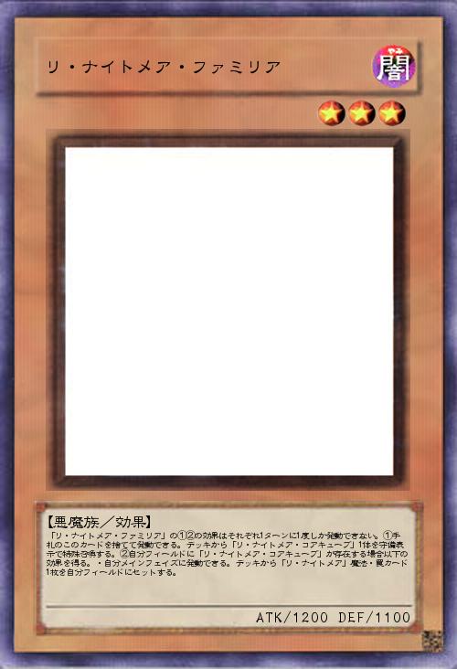 | 「リ・ナイトメア・ファミリア」の①②の効果はそれぞれ1ターンに1度しか発動できない。①手札のこのカードを捨てて発動できる。デッキから「リ・ナイトメア・コアキューブ」1体を守備表示で特殊召喚する。②自分フィールドに「リ・ナイトメア・コアキューブ」が存在する場合以下の効果を得る。・自分メインフェイズに発動できる。デッキから「リ・ナイトメア」魔法・罠カード1枚を自分フィールドにセットする。 | |||