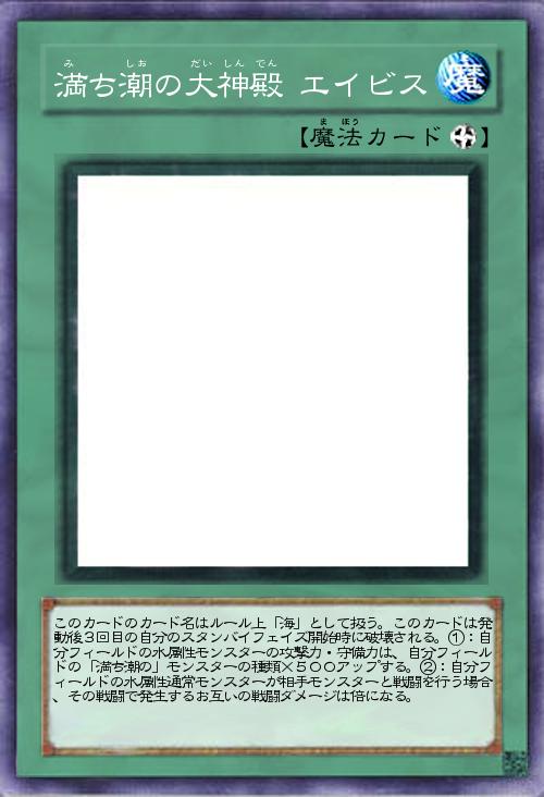 | このカードのカード名はルール上「海」として扱う。このカードは発動後3回目の自分のスタンバイフェイズ開始時に破壊される。①:自分フィールドの水属性モンスターの攻撃力・守備力は、自分フィールドの「満ち潮の」モンスターの種類×500アップする。②:自分フィールドの水属性通常モンスターが相手モンスターと戦闘を行う場合、その戦闘で発生するお互いの戦闘ダメージは倍になる。 | |||