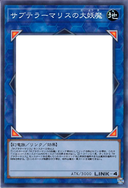| 「サブテラーマリス」モンスター2体以上 ①:このカードが「サブテラーマリスの妖魔」をリンク素材にしてリンク召喚されている場合、このカードはリバースモンスター以外のモンスターの効果を受けない。②:1ターンに1度、デッキから「サブテラーマリス」モンスター1体を選んでこのカードのリンク先に表側守備表示または裏側守備表示で特殊召喚する。③:このカードが戦闘を行う場合、相手は魔法・罠カードを発動できない。 | |||