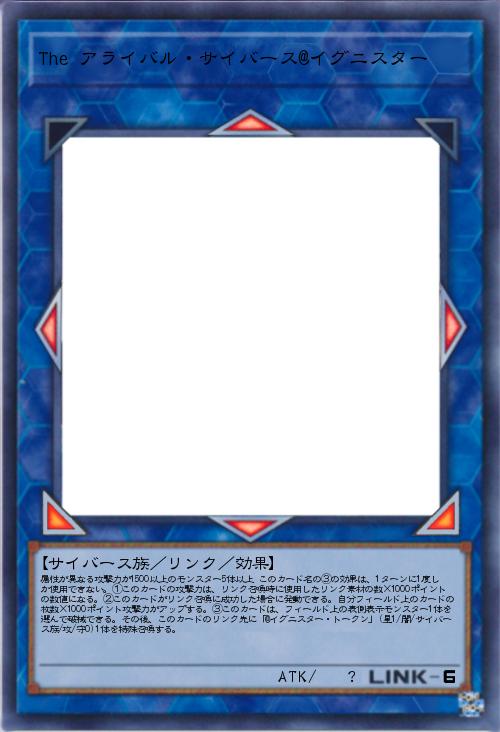 | 属性が異なる攻撃力が1500以上のモンスター5体以上 このカード名の③の効果は、1ターンに1度しか使用できない。①このカードの攻撃力は、リンク召喚時に使用したリンク素材の数×1000ポイントの数値になる。②このカードがリンク召喚に成功した場合に発動できる。自分フィールド上のカードの枚数×1000ポイント攻撃力がアップする。③このカードは、フィールド上の表側表示モンスター1体を選んで破械できる。その後、このカードのリンク先に「@イグニスター・トークン」(星1/闇/サイバース族/攻/守0)1体を特殊召喚する。 | |||