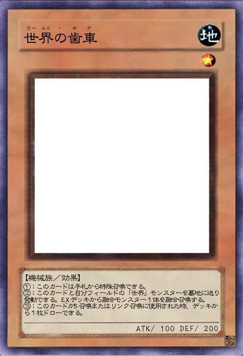 | ①:このカードは手札から特殊召喚できる。 ②:このカードと自分フィールドの「世界」モンスターを墓地に送り発動できる。EXデッキから融合モンスター1体を融合召喚する。 ③:このカードがS召喚またはリンク召喚に使用された時、デッキから1枚ドローできる。 | |||