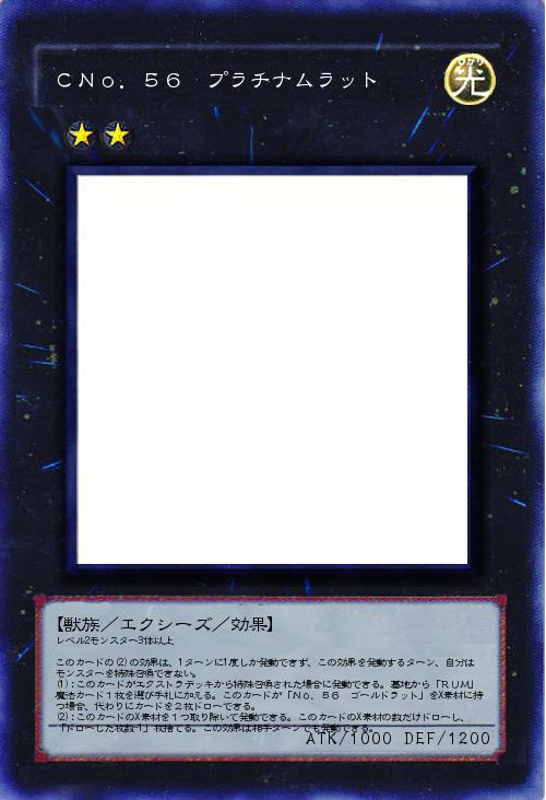 | レベル2モンスター3体以上 このカードの(2)の効果は、1ターンに1度しか発動できず、この効果を発動するターン、自分はモンスターを特殊召喚できない。 (1):このカードがエクストラデッキから特殊召喚された場合に発動できる。墓地から「RUM」魔法カード1枚を選び手札に加える。このカードが「No.56 ゴールドラット」をX素材に持つ場合、代わりにカードを2枚ドローできる。 (2):このカードのX素材を1つ取り除いて発動できる。このカードのX素材の数だけドローし、「ドローした枚数-1」枚捨てる。この効果は相手ターンでも発動できる。 | |||