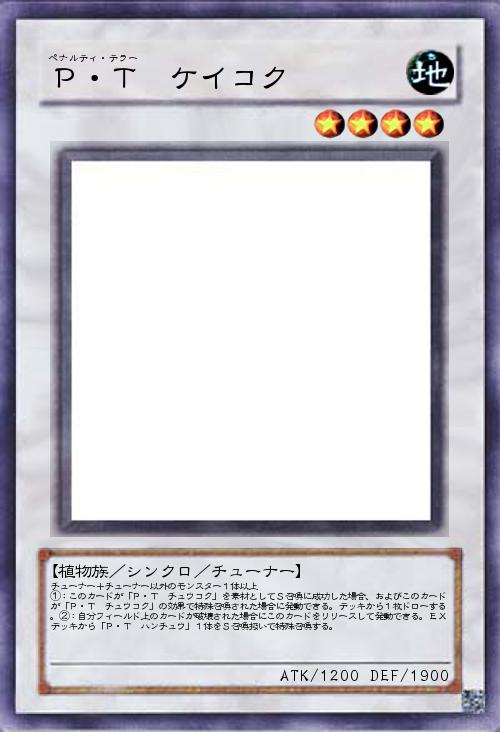 | チューナー+チューナー以外のモンスター1体以上 ①:このカードが「P・T チュウコク」を素材としてS召喚に成功した場合、およびこのカードが「P・T チュウコク」の効果で特殊召喚された場合に発動できる。デッキから1枚ドローする。②:自分フィールド上のカードが破壊された場合にこのカードをリリースして発動できる。EXデッキから「P・T ハンチュウ」1体をS召喚扱いで特殊召喚する。 | |||