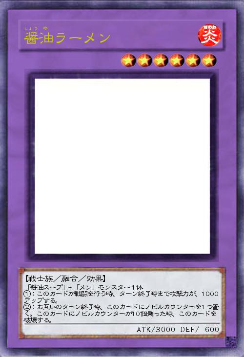 | 「醤油スープ」+「メン」モンスター1体 ①:このカードが戦闘を行う時、ターン終了時まで攻撃力が、1000アップする。 ②:お互いのターン終了時、このカードにノビルカウンターを1つ置く。このカードにノビルカウンターが10個乗った時、このカードを破壊する。 | |||