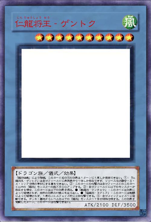 | 「龍将結義」により降臨。このカード名の④の効果は1ターンに1度しか使用できない。①:「仁龍将王‐ゲントク」は自分フィールドに表側表示で1体しか存在できず、リリース及び融合・S・X・リンク召喚の素材にする事もできない。②:このカードの攻撃力は自分フィールドのこのカード以外の「龍将」モンスターの数×500アップする。③:自分フィールドに以下のモンスターが存在する場合、このカードは以下の効果を得る。●「義龍将‐ウンチョウ」:このカードは効果によって破壊されず、相手の効果の対象にもならない。●「猛龍将‐ヨクトク」:このカードは戦闘によって破壊されず、1度のバトルフェイズ中に2回攻撃できる。④:自分メインフェイズ1に発動できる。デッキ・墓地からレベル8以下の「龍将」モンスター1体を特殊召喚する。この効果を発動したターン、このカードは攻撃できない。 | |||