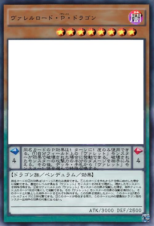 | 同名カードの②の効果は1ターンに1度のみ使用できる。①このカードを手札からP召喚に成功した場合に発動できる。墓地のレベルが異なる「ヴァレット」モンスター2体を選択し、選択した2体のモンスターを特殊召喚する。②自分フィールド上の「ヴァレット」モンスターの効果が発動した場合、相手フィールド上のカード1枚を対象にして発動できる。その「ヴァレット」モンスターの効果の発動を無効にし、そのカードと対象とした相手カードをそれぞれ除外する。この効果を使用したターン、このカードは1度のバトルフェイズに2回攻撃できる。③このカードが存在する限り、このカード以外の闇属性ドラゴン族モンスターは相手の効果の対象にならない。 | |||
