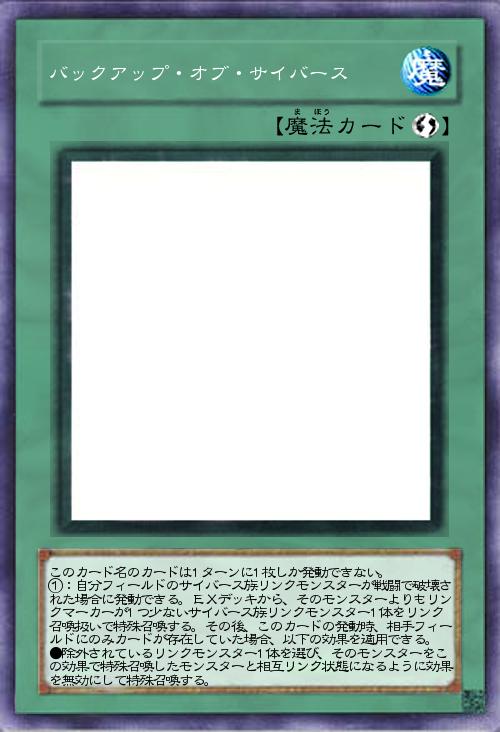| このカード名のカードは1ターンに1枚しか発動できない。 ①:自分フィールドのサイバース族リンクモンスターが戦闘で破壊された場合に発動できる。EXデッキから、そのモンスターよりもリンクマーカーが1つ少ないサイバース族リンクモンスター1体をリンク召喚扱いで特殊召喚する。その後、このカードの発動時、相手フィールドにのみカードが存在していた場合、以下の効果を適用できる。 ●除外されているリンクモンスター1体を選び、そのモンスターをこの効果で特殊召喚したモンスターと相互リンク状態になるように効果を無効にして特殊召喚する。 | |||