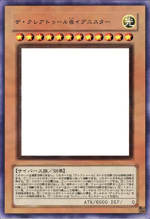 | このカードは通常召喚できない。このカードは「クレアトゥール」カードの効果でのみ特殊召喚できる。①:フィールドのモンスターを6体墓地へ送って発動できる。このカードを手札から特殊召喚する。②:このカードの攻撃力は、フィールドのカードの数×1000アップする。③:このカードは他のカードの効果を受けない。④:相手ターンに1度、フィールドの効果モンスター1体を対象として発動できる。そのモンスターはターン終了時まで相手の効果を受けない。⑤:1ターンに1度、フィールドのカード1枚を対象として破壊し、デッキから「クレアトゥール」モンスターを特殊召喚する。⑥:このカードがフィールドから離れた場合、デッキから「クレアトゥール」モンスターを特殊召喚する。⑦:このカードは「レフレッシ」モンスターとしても扱う。 | |||