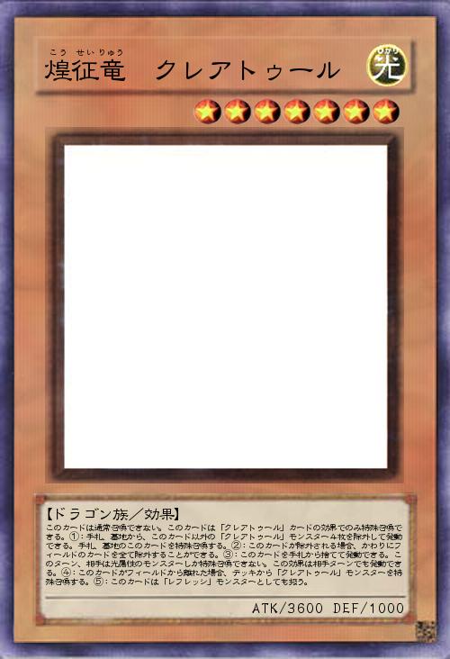 | このカードは通常召喚できない。このカードは「クレアトゥール」カードの効果でのみ特殊召喚できる。①:手札、墓地から、このカード以外の「クレアトゥール」モンスター4枚を除外して発動できる。手札、墓地のこのカードを特殊召喚する。②:このカードが除外される場合、かわりにフィールドのカードを全て除外することができる。③:このカードを手札から捨てて発動できる。このターン、相手は光属性のモンスターしか特殊召喚できない。この効果は相手ターンでも発動できる。④:このカードがフィールドから離れた場合、デッキから「クレアトゥール」モンスターを特殊召喚する。⑤:このカードは「レフレッシ」モンスターとしても扱う。 | |||