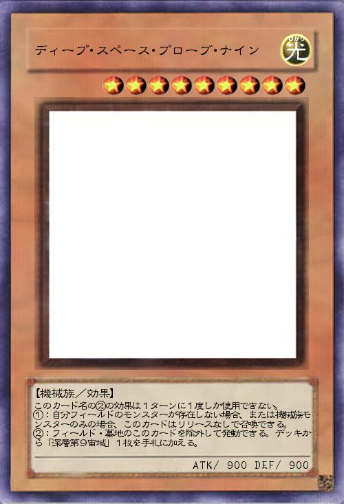 | このカード名の②の効果は1ターンに1度しか使用できない。 ①:自分フィールドのモンスターが存在しない場合、または機械族モンスターのみの場合、このカードはリリースなしで召喚できる。 ②:フィールド・墓地のこのカードを除外して発動できる。デッキから「深層第9宙域」1枚を手札に加える。 | |||
