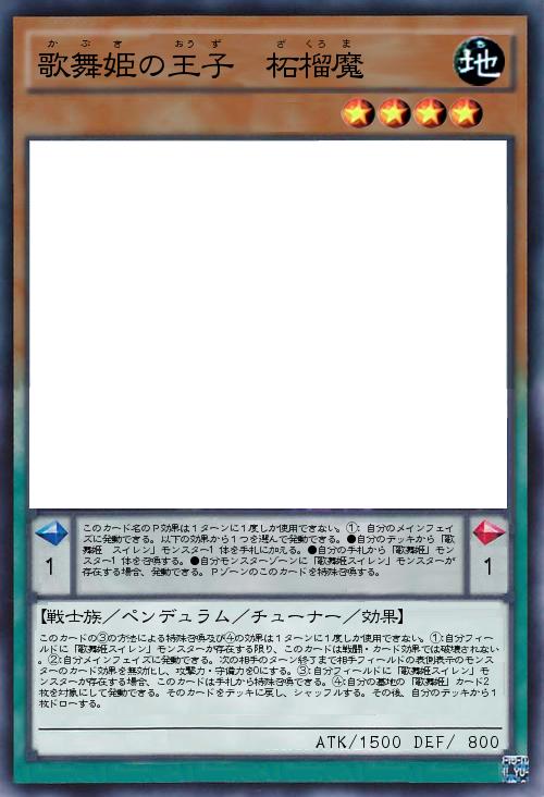 | このカードの③の方法による特殊召喚及び④の効果は1ターンに1度しか使用できない。①:自分フィールドに「歌舞姫スイレン」モンスターが存在する限り、このカードは戦闘・カード効果では破壊されない。②:自分メインフェイズに発動できる。次の相手のターン終了まで相手フィールドの表側表示のモンスターのカード効果を無効化し、攻撃力・守備力を0にする。③:自分フィールドに「歌舞姫スイレン」モンスターが存在する場合、このカードは手札から特殊召喚できる。④:自分の墓地の「歌舞姫」カード2枚を対象にして発動できる。そのカードをデッキに戻し、シャッフルする。その後、自分のデッキから1枚ドローする。 | |||
