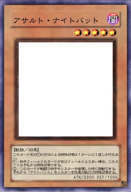 | このカード名の①の方法による特殊召喚は1ターンに1度しか行えない。 ①:相手フィールドのカードが自分フィールドより多い場合、このカードは手札から特殊召喚できる。 ②:このカードが戦闘で相手モンスターを破壊した時に発動できる。手札から「ナイトバット」モンスターを任意の数だけ特殊召喚する。 | |||