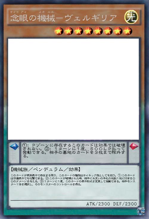| このカードが表側表示で存在する限り、このカードの種族はサイキック族としても扱う。①:このカードは守備表示でも攻撃できる。②:このカードが破壊された時、相手にお互いの手札の枚数1枚に付き800のダメージを与える。③:1ターンに1度、このカードの表示形式を変更して発動できる。相手モンスター1体を選択し、そのモンスターのコントロールを得る。 | |||
