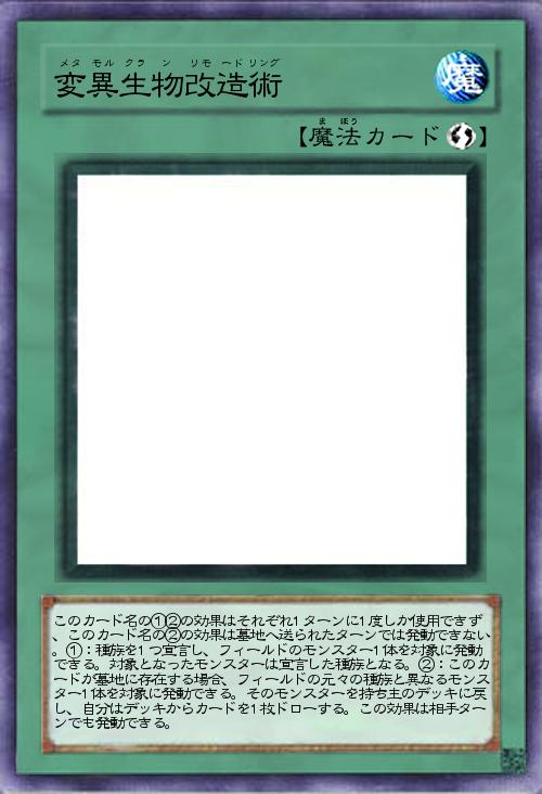 | このカード名の①②の効果はそれぞれ1ターンに1度しか使用できず、このカード名の②の効果は墓地へ送られたターンでは発動できない。①:種族を1つ宣言し、フィールドのモンスター1体を対象に発動できる。対象となったモンスターは宣言した種族となる。②:このカードが墓地に存在する場合、フィールドの元々の種族と異なるモンスター1体を対象に発動できる。そのモンスターを持ち主のデッキに戻し、自分はデッキからカードを1枚ドローする。この効果は相手ターンでも発動できる。 | |||
