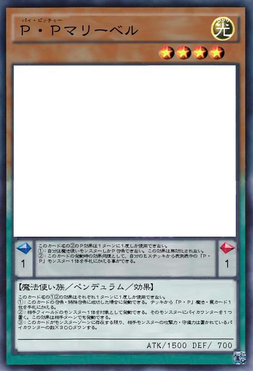 | このカード名の②のP効果は1ターンに1度しか使用できない。 ①:自分は魔法使いモンスターしかP召喚できない。この効果は無効化されない。 ②:このカードの発動時の効果処理として、自分のEXデッキから表側表示の「P・P」モンスター1体を手札に加える事ができる。 | |||