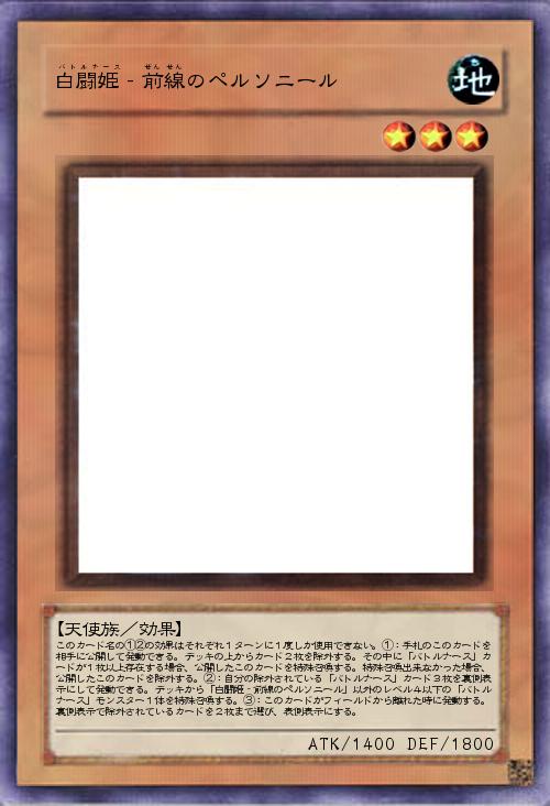 | このカード名の①②の効果はそれぞれ1ターンに1度しか使用できない。①:手札のこのカードを相手に公開して発動できる。デッキの上からカード2枚を除外する。その中に「バトルナース」カードが1枚以上存在する場合、公開したこのカードを特殊召喚する。特殊召喚出来なかった場合、公開したこのカードを除外する。②:自分の除外されている「バトルナース」カード3枚を裏側表示にして発動できる。デッキから「白闘姫‐前線のペルソニール」以外のレベル4以下の「バトルナース」モンスター1体を特殊召喚する。③:このカードがフィールドから離れた時に発動する。裏側表示で除外されているカードを2枚まで選び、表側表示にする。 | |||