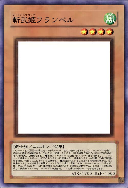 | このカード名の②④の効果はそれぞれ1ターンに1度しか使用できない。①:このカードの召喚に成功した場合に発動できる。手札から「武姫」モンスター1体を特殊召喚する。②:以下の効果から1つを選択して発動できる。 ●自分フィールドの「武姫」モンスター1体を対象とし、 このカードを装備カード扱いとしてそのモンスターに装備する。 装備モンスターが戦闘・効果で破壊される場合、代わりにこのカードを破壊する。 ●装備されているこのカードを特殊召喚する。③:装備モンスターが相手LPに戦闘ダメージを与えた場合に発動できる。デッキからカードを1枚ドローする。④:このカードが「斬武姫」に装備されている場合に発動できる。このカードを特殊召喚し、装備モンスターをこのカードに装備する。この効果は相手ターンでも使用できる。 | |||
