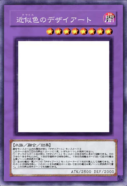 | 融合モンスター以外の属性が同じ「デザイアート」モンスター×3 このカード名の①②の効果は1ターンに1度、いずれか1つしか使用できない。 ①:デッキからカード名が同じ「デザイアート」モンスター3体を相手に見せて発動できる。そのうちの1体を手札に加え、1体を守備表示で特殊召喚し、1体を永続魔法カード扱いで自分の魔法&罠ゾーンに表側表示で置く。 ②:自分の魔法・罠ゾーンの「デザイアート」モンスターカード1枚を対象として発動できる。そのカードを特殊召喚し、このカードを永続魔法カード扱いで自分の魔法&罠ゾーンに表側表示で置く。この効果は相手ターンでも発動できる。 | |||