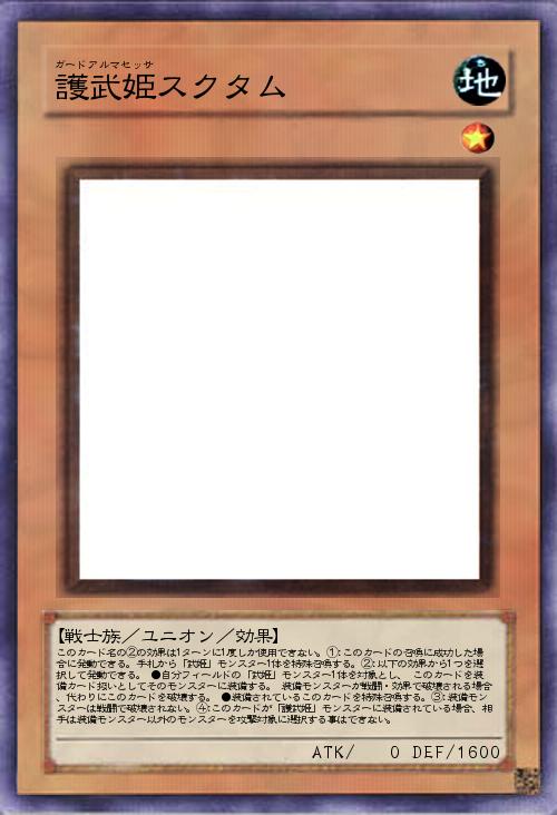 | このカード名の②の効果は1ターンに1度しか使用できない。①:このカードの召喚に成功した場合に発動できる。手札から「武姫」モンスター1体を特殊召喚する。②:以下の効果から1つを選択して発動できる。 ●自分フィールドの「武姫」モンスター1体を対象とし、 このカードを装備カード扱いとしてそのモンスターに装備する。 装備モンスターが戦闘・効果で破壊される場合、代わりにこのカードを破壊する。 ●装備されているこのカードを特殊召喚する。③:装備モンスターは戦闘で破壊されない。④:このカードが「護武姫」モンスターに装備されている場合、相手は装備モンスター以外のモンスターを攻撃対象に選択する事はできない。 | |||