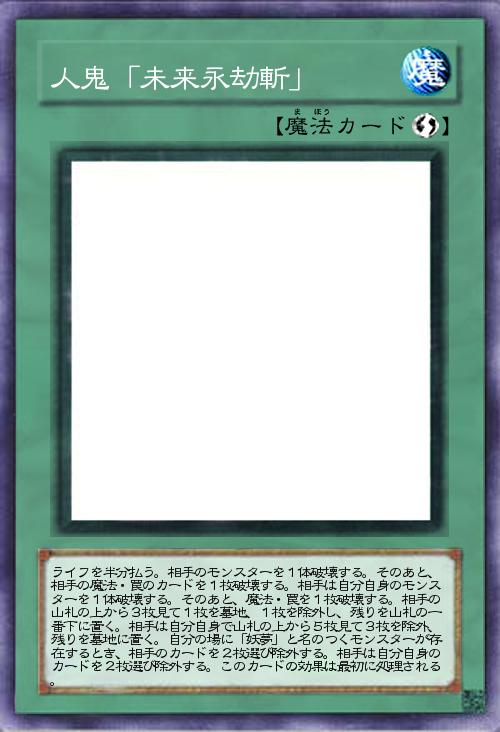 | ライフを半分払う。相手のモンスターを1体破壊する。そのあと、相手の魔法・罠のカードを1枚破壊する。相手は自分自身のモンスターを1体破壊する。そのあと、魔法・罠を1枚破壊する。相手の山札の上から3枚見て1枚を墓地、1枚を除外し、残りを山札の一番下に置く。相手は自分自身で山札の上から5枚見て3枚を除外、残りを墓地に置く。自分の場に「妖夢」と名のつくモンスターが存在するとき、相手のカードを2枚選び除外する。相手は自分自身のカードを2枚選び除外する。このカードの効果は最初に処理される。 | |||