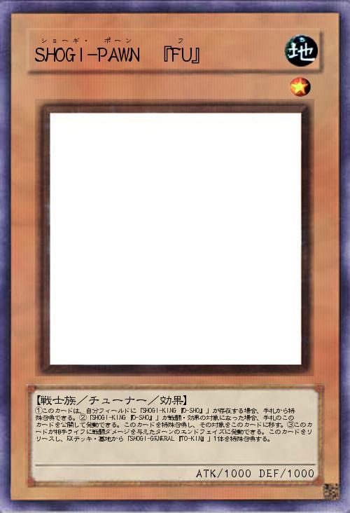 | ①このカードは、自分フィールドに「SHOGI-KING『O-SHO』」が存在する場合、手札から特殊召喚できる。②「SHOGI-KING『O-SHO』」が戦闘・効果の対象になった場合、手札のこのカードを公開して発動できる。このカードを特殊召喚し、その対象をこのカードに移す。③このカードが相手ライフに戦闘ダメージを与えたターンのエンドフェイズに発動できる。このカードをリリースし、EXデッキ・墓地から「SHOGI-GENERAL『TO-KIN』」1体を特殊召喚する。 | |||