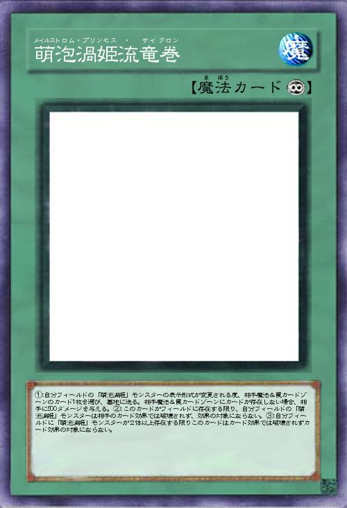 | ①:自分フィールドの「萌泡渦姫」モンスターの表示形式が変更される度、相手魔法&罠カードゾーンのカード1枚を選び、墓地に送る。相手魔法&罠カードゾーンにカードが存在しない場合、相手に500ダメージを与える。②:このカードがフィールドに存在する限り、自分フィールドの「萌泡渦姫」モンスターは相手のカード効果では破壊されず、効果の対象にならない。③:自分フィールドに「萌泡渦姫」モンスターが2体以上存在する限りこのカードはカード効果では破壊されずカード効果の対象にならない。 | |||