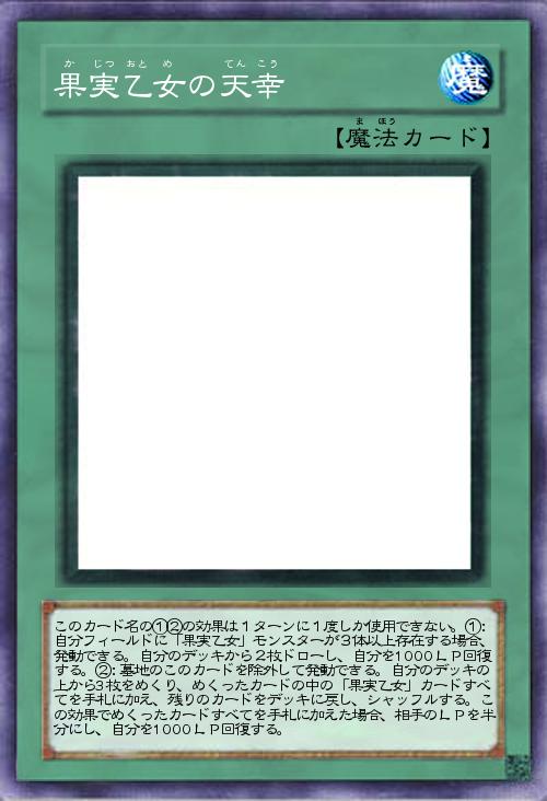 | このカード名の①②の効果は1ターンに1度しか使用できない。①:自分フィールドに「果実乙女」モンスターが3体以上存在する場合、発動できる。自分のデッキから2枚ドローし、自分を1000LP回復する。②:墓地のこのカードを除外して発動できる。自分のデッキの上から3枚をめくり、めくったカードの中の「果実乙女」カードすべてを手札に加え、残りのカードをデッキに戻し、シャッフルする。この効果でめくったカードすべてを手札に加えた場合、相手のLPを半分にし、自分を1000LP回復する。 | |||