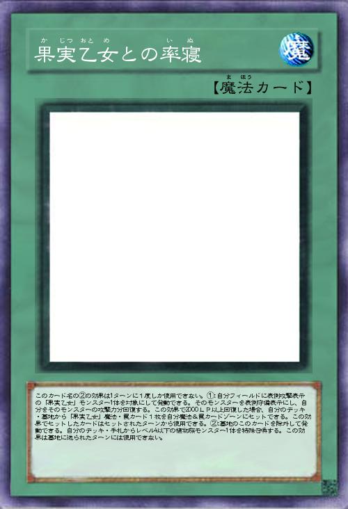 | このカード名の②の効果は1ターンに1度しか使用できない。①:自分フィールドに表側攻撃表示の「果実乙女」モンスター1体を対象にして発動できる。そのモンスターを表側守備表示にし、自分をそのモンスターの攻撃力分回復する。この効果で2000LP以上回復した場合、自分のデッキ・墓地から「果実乙女」魔法・罠カード1枚を自分魔法&罠カードゾーンにセットできる。この効果でセットしたカードはセットされたターンから使用できる。②:墓地のこのカードを除外して発動できる。自分のデッキ・手札からレベル4以下の植物族モンスター1体を特殊召喚する。この効果は墓地に送られたターンには使用できない。 | |||