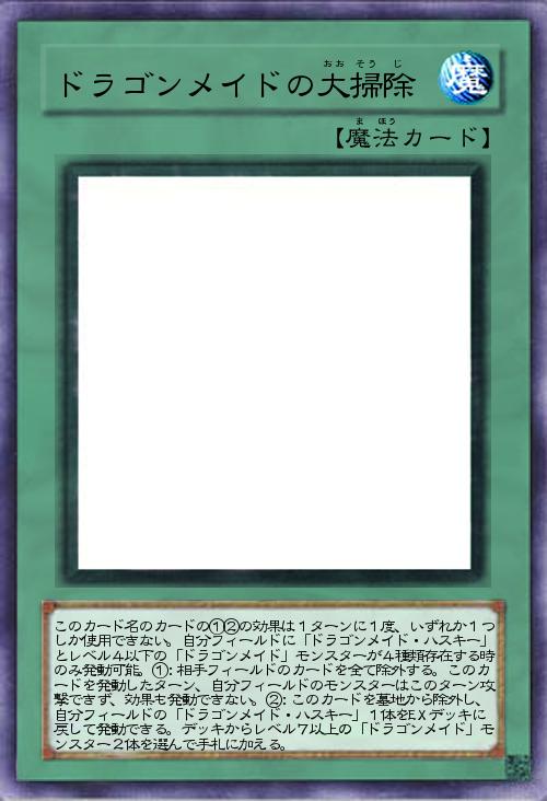 | このカード名のカードの①②の効果は1ターンに1度、いずれか1つしか使用できない。自分フィールドに「ドラゴンメイド・ハスキー」とレベル4以下の「ドラゴンメイド」モンスターが4種類存在する時のみ発動可能。①:相手フィールドのカードを全て除外する。このカードを発動したターン、自分フィールドのモンスターはこのターン攻撃できず、効果も発動できない。②:このカードを墓地から除外し、自分フィールドの「ドラゴンメイド・ハスキー」1体をEXデッキに戻して発動できる。デッキからレベル7以上の「ドラゴンメイド」モンスター2体を選んで手札に加える。 | |||