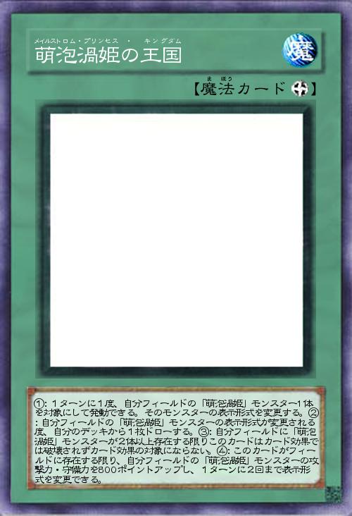 | ①:1ターンに1度、自分フィールドの「萌泡渦姫」モンスター1体を対象にして発動できる。そのモンスターの表示形式を変更する。②:自分フィールドの「萌泡渦姫」モンスターの表示形式が変更される度、自分のデッキから1枚ドローする。③:自分フィールドに「萌泡渦姫」モンスターが2体以上存在する限りこのカードはカード効果では破壊されずカード効果の対象にならない。④:このカードがフィールドに存在する限り、自分フィールドの「萌泡渦姫」モンスターの攻撃力・守備力を800ポイントアップし、1ターンに2回まで表示形式を変更できる。 | |||