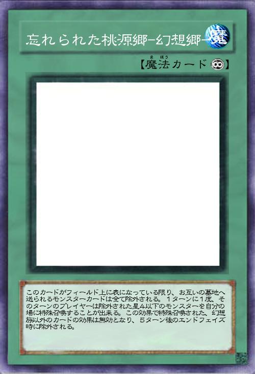 | このカードがフィールド上に表になっている限り、お互いの墓地へ送られるモンスターカードは全て除外される。1ターンに1度、そのターンのプレイヤーは除外された星4以下のモンスターを自分の場に特殊召喚することが出来る。この効果で特殊召喚された、幻想族以外のカードの効果は無効となり、5ターン後のエンドフェイズ時に除外される。 | |||