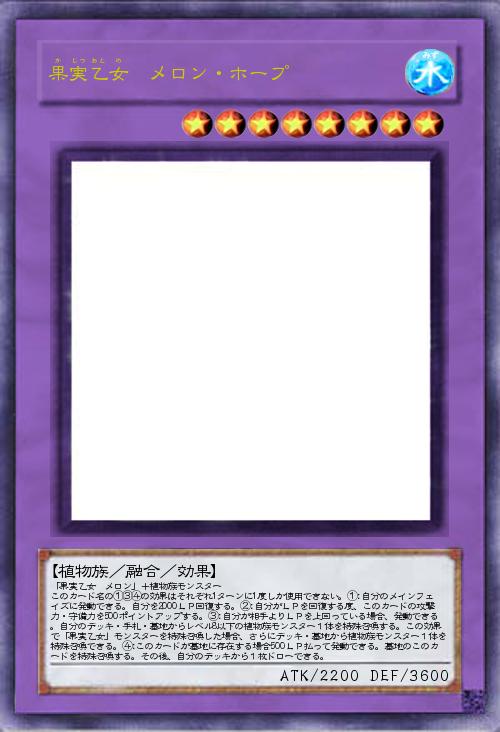 | 「果実乙女 メロン」+植物族モンスター このカード名の①③④の効果はそれぞれ1ターンに1度しか使用できない。①:自分のメインフェイズに発動できる。自分を2000LP回復する。②:自分がLPを回復する度、このカードの攻撃力・守備力を500ポイントアップする。③:自分が相手よりLPを上回っている場合、発動できる。自分のデッキ・手札・墓地からレベル8以下の植物族モンスター1体を特殊召喚する。この効果で「果実乙女」モンスターを特殊召喚した場合、さらにデッキ・墓地から植物族モンスター1体を特殊召喚できる。④:このカードが墓地に存在する場合500LP払って発動できる。墓地のこのカードを特殊召喚する。その後、自分のデッキから1枚ドローできる。 | |||