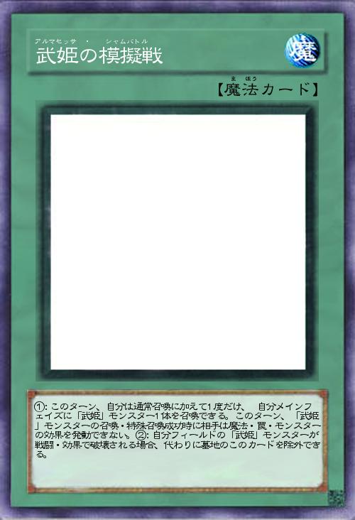 | ①:このターン、自分は通常召喚に加えて1度だけ、 自分メインフェイズに「武姫」モンスター1体を召喚できる。このターン、「武姫」モンスターの召喚・特殊召喚成功時に相手は魔法・罠・モンスターの効果を発動できない。②:自分フィールドの「武姫」モンスターが戦闘・効果で破壊される場合、代わりに墓地のこのカードを除外できる。 | |||