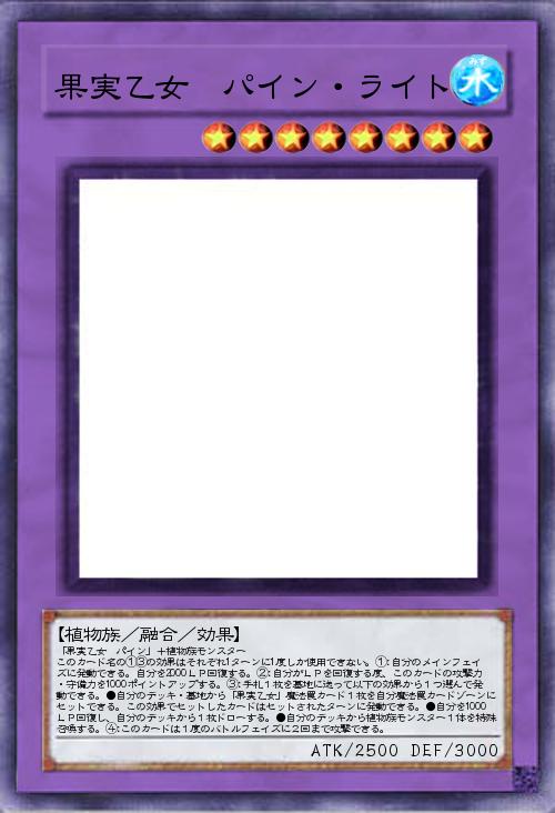 | 「果実乙女 パイン」+植物族モンスター このカード名の①③の効果はそれぞれ1ターンに1度しか使用できない。①:自分のメインフェイズに発動できる。自分を2000LP回復する。②:自分がLPを回復する度、このカードの攻撃力・守備力を1000ポイントアップする。③:手札1枚を墓地に送って以下の効果から1つ選んで発動できる。●自分のデッキ・墓地から「果実乙女」魔法罠カード1枚を自分魔法罠カードゾーンにセットできる。この効果でセットしたカードはセットされたターンに発動できる。●自分を1000LP回復し、自分のデッキから1枚ドローする。●自分のデッキから植物族モンスター1体を特殊召喚する。④:このカードは1度のバトルフェイズに2回まで攻撃できる。 | |||