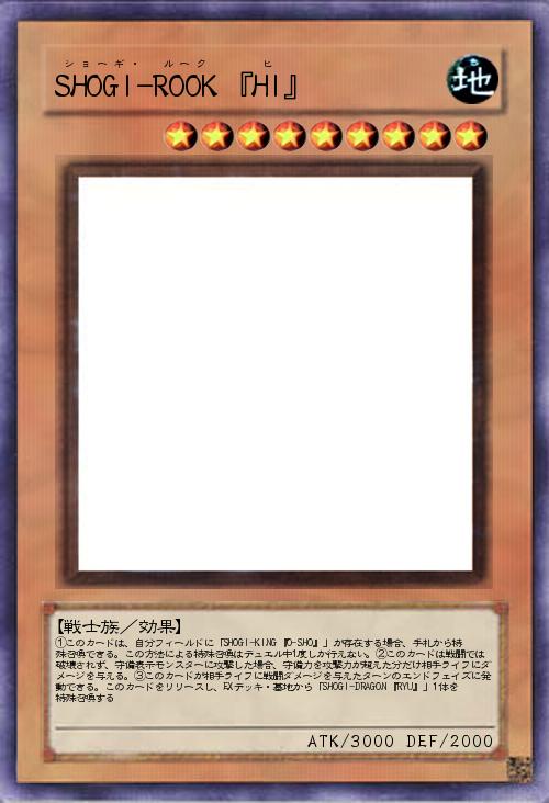| ①このカードは、自分フィールドに「SHOGI-KING『O-SHO』」が存在する場合、手札から特殊召喚できる。この方法による特殊召喚はデュエル中1度しか行えない。②このカードは戦闘では破壊されず、守備表示モンスターに攻撃した場合、守備力を攻撃力が超えた分だけ相手ライフにダメージを与える。③このカードが相手ライフに戦闘ダメージを与えたターンのエンドフェイズに発動できる。このカードをリリースし、EXデッキ・墓地から「SHOGI-DRAGON『RYU』」1体を特殊召喚する | |||