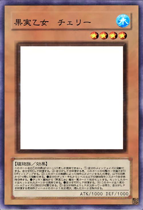 | このカード名の①の効果は1ターンに1度しか使用できない。①:自分のメインフェイズに発動できる。自分を500LP回復する。②:自分がLPを回復する度、このカードの攻撃力・守備力を100ポイントアップする。③:このカードの戦闘によって相手にダメージを与えた場合、以下の効果から1つ選んで発動できる。●自分のデッキ・手札からレベル4以下の植物族モンスター1体を特殊召喚する。●デッキ・墓地から「果実乙女」魔法・罠カード1枚をセットする。セットしたカードはセットされたターンから使用できる。●自分を1000LP回復する。④:このカードは1度のバトルフェイズに2回だけ攻撃できる。⑤:自分が相手よりLPが上回っている限り、自分がLPを回復する度相手フィールドのカード1枚を選び、選んだカードを除外する。 | |||