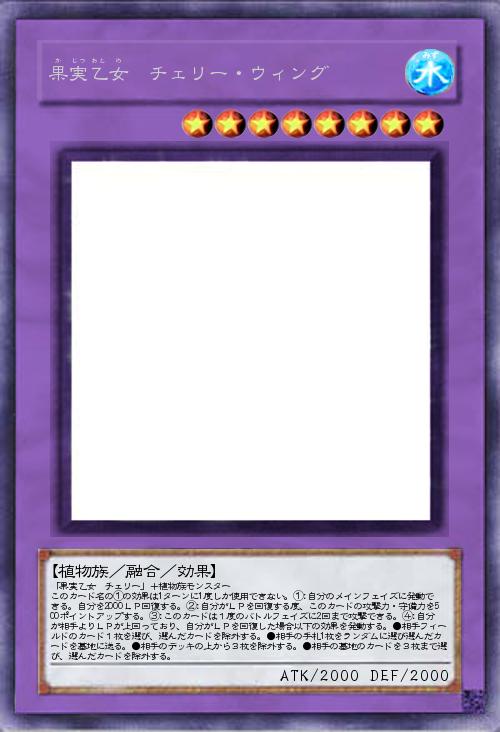 | 「果実乙女 チェリー」+植物族モンスター このカード名の①の効果は1ターンに1度しか使用できない。①:自分のメインフェイズに発動できる。自分を2000LP回復する。②:自分がLPを回復する度、このカードの攻撃力・守備力を500ポイントアップする。③:このカードは1度のバトルフェイズに2回まで攻撃できる。④:自分が相手よりLPが上回っており、自分がLPを回復した場合以下の効果を発動する。●相手フィールドのカード1枚を選び、選んだカードを除外する。●相手の手札1枚をランダムに選び選んだカードを墓地に送る。●相手のデッキの上から3枚を除外する。●相手の墓地のカードを3枚まで選び、選んだカードを除外する。 | |||
