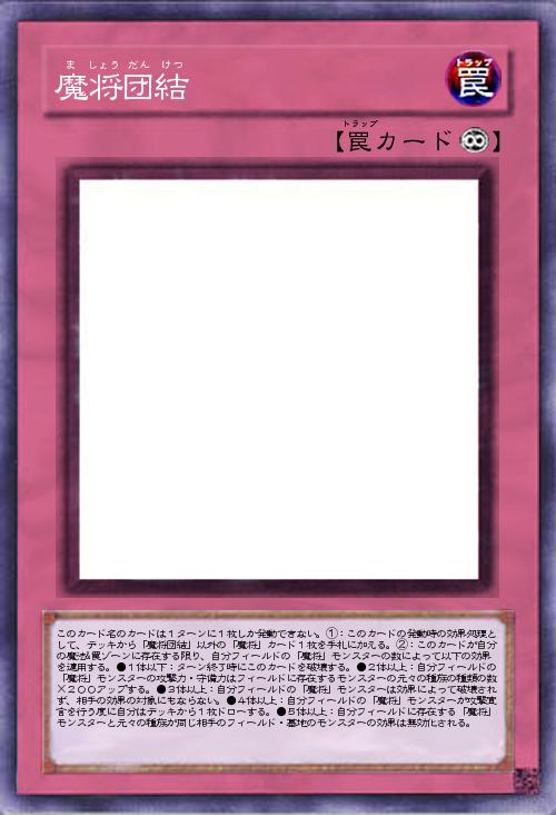 | このカード名のカードは1ターンに1枚しか発動できない。①:このカードの発動時の効果処理として、デッキから「魔将団結」以外の「魔将」カード1枚を手札に加える。②:このカードが自分の魔法&罠ゾーンに存在する限り、自分フィールドの「魔将」モンスターの数によって以下の効果を適用する。●1体以下:ターン終了時にこのカードを破壊する。●2体以上:自分フィールドの「魔将」モンスターの攻撃力・守備力はフィールドに存在するモンスターの元々の種族の種類の数×200アップする。●3体以上:自分フィールドの「魔将」モンスターは効果によって破壊されず、相手の効果の対象にもならない。●4体以上:自分フィールドの「魔将」モンスターが攻撃宣言を行う度に自分はデッキから1枚ドローする。●5体以上:自分フィールドに存在する「魔将」モンスターと元々の種族が同じ相手のフィールド・墓地のモンスターの効果は無効化される。 | |||